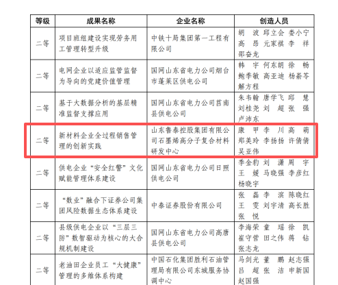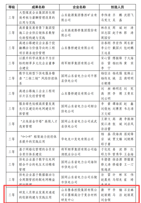 10月31日,第三十九届山东省企业管理现代化创新成果获奖名单发布,研发中心2项成果获奖,在该平台获奖数量和获奖级别上再创新高。其中《新材料企业全过程销售管理的创新实践》荣获二等奖,《研发人员职业发展双通道的创新构建与实践应用》荣获三等奖。